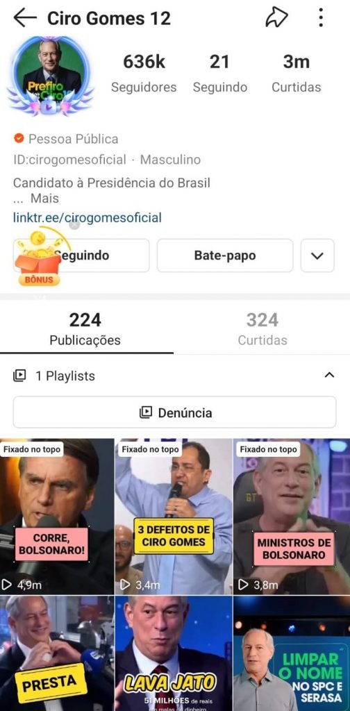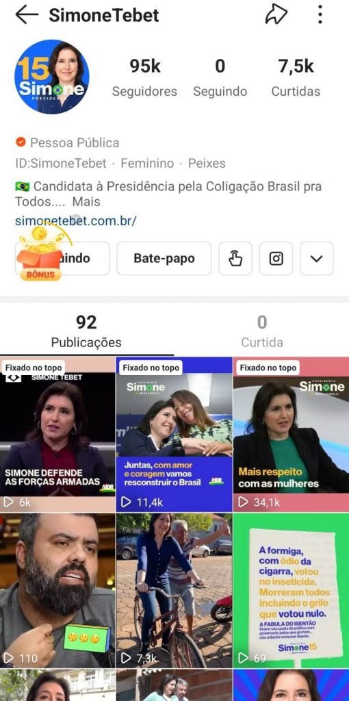 Terceiro colocado nas pesquisas eleitorais, o pedetista Ciro Gomes também mostra bons números no Kwai, ainda que não engaje tanto quanto Bolsonaro e Lula. Com 636 mil seguidores, ele já conseguiu 3 milhões de curtidas no material que postou. Correndo (bem) atrás, aparece a candidata que chegou por último nessa rede (e na disputa pelo Planalto): Simone Tebet (MDB), que tem 95 mil seguidores e foi curtida 7,5 mil vezes pelos usuários da plataforma.