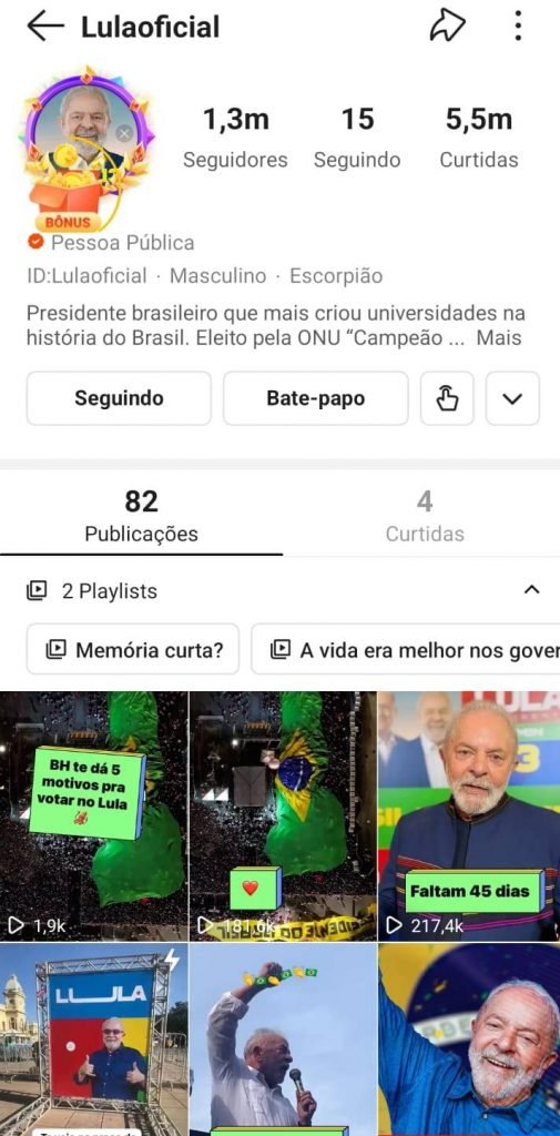 No Kwai, por exemplo, Lula ostenta o mesmo número de “curtidas” que Bolsonaro – 5,5 milhões – no material postado, apesar de possuir cerca da metade de seguidores (1,3 milhões contra 2,2 milhões) e de ter publicado bem menos conteúdo (82 posts do petista contra 244 de Bolsonaro)