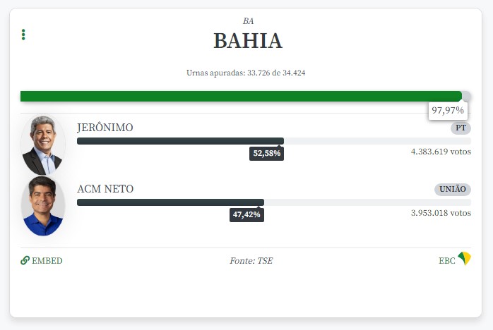 O candidato Jerônimo (PT) venceu a disputa para o governo da Bahia, com 52,53% dos votos válidos. ACM Neto (União Brasil) ficou em segundo lugar, com 47,47% dos votos válidos.