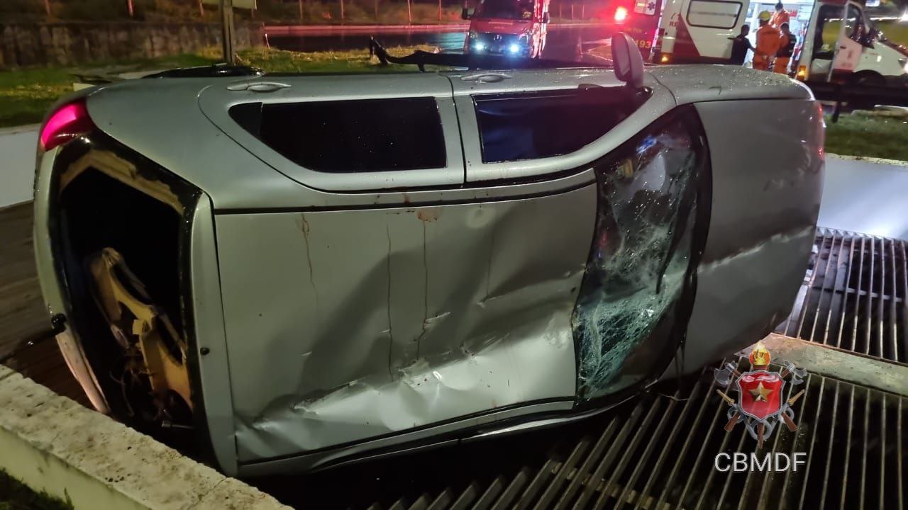 Entre os passageiros estavam dois adolescentes, que tiveram apenas ferimentos e foram transportados para o HRT Foto: CBMDF Um capotamento ...
