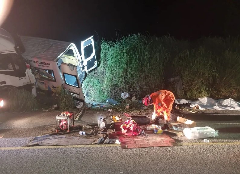 O veículo teria batido de frente com o caminhão. Os mortos são quatro homens, sete mulheres e um bebê.