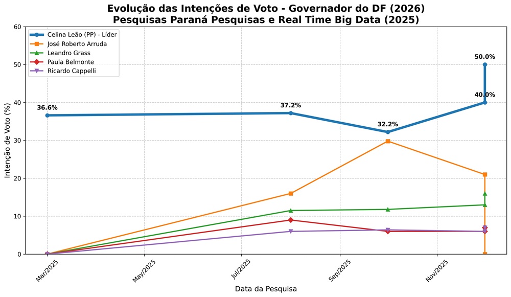 De acordo com a compilação de dados realizada pelo Radar DF, com base em diversas pesquisas de intenção de voto registradas no TSE até o momento atual, Celina Leão apresenta uma candidatura com clara vantagem competitiva.